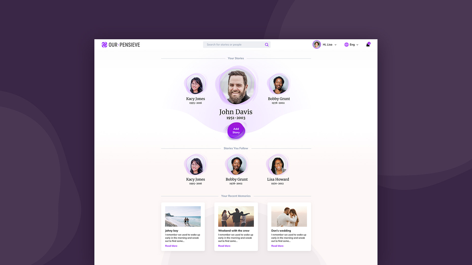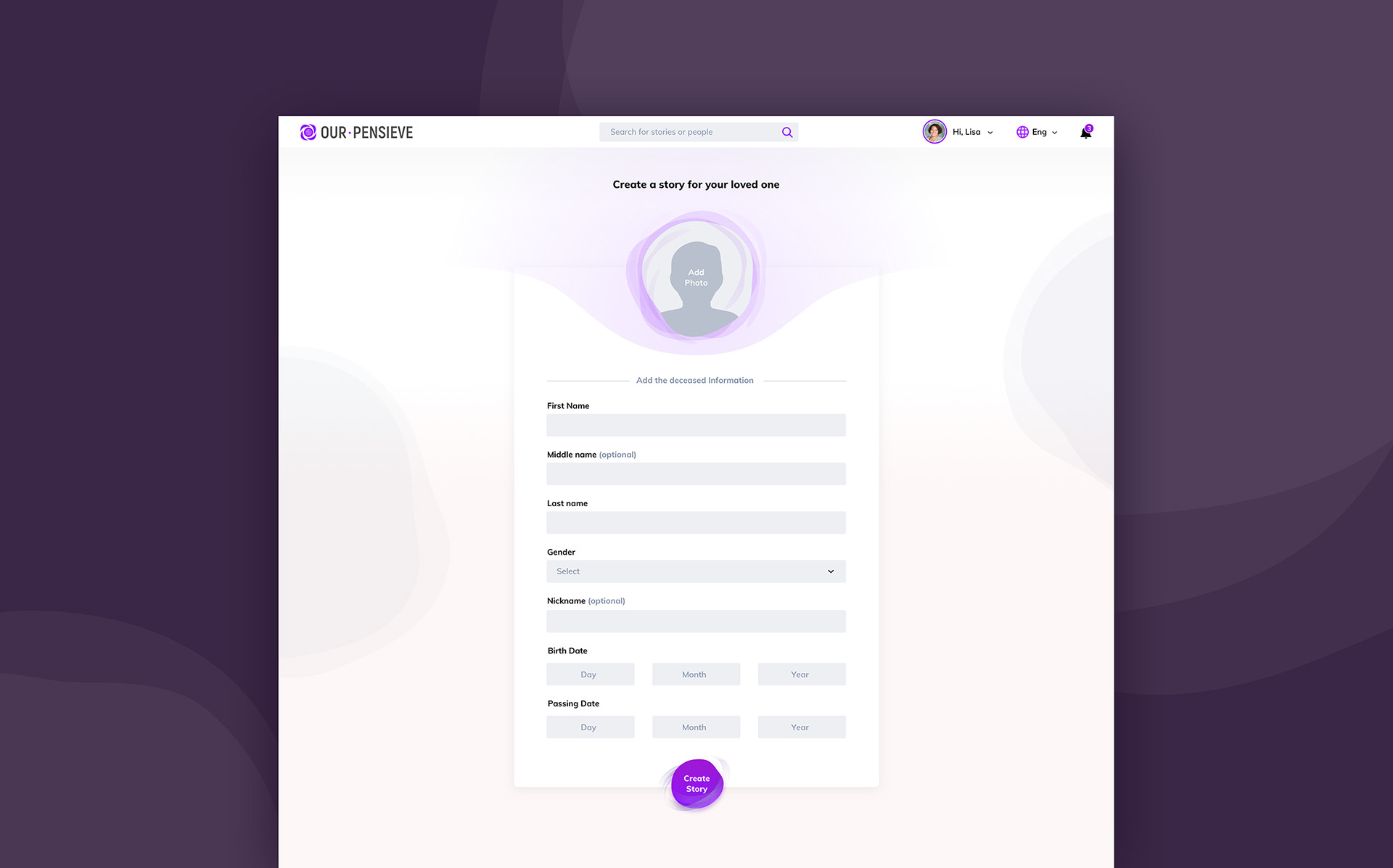 Product design for a perpetuation project that allows a family to honor their loved one by sharing stories, photos, videos, and eulogies with other family and friends. This creates a community around the memory and a lasting memorial